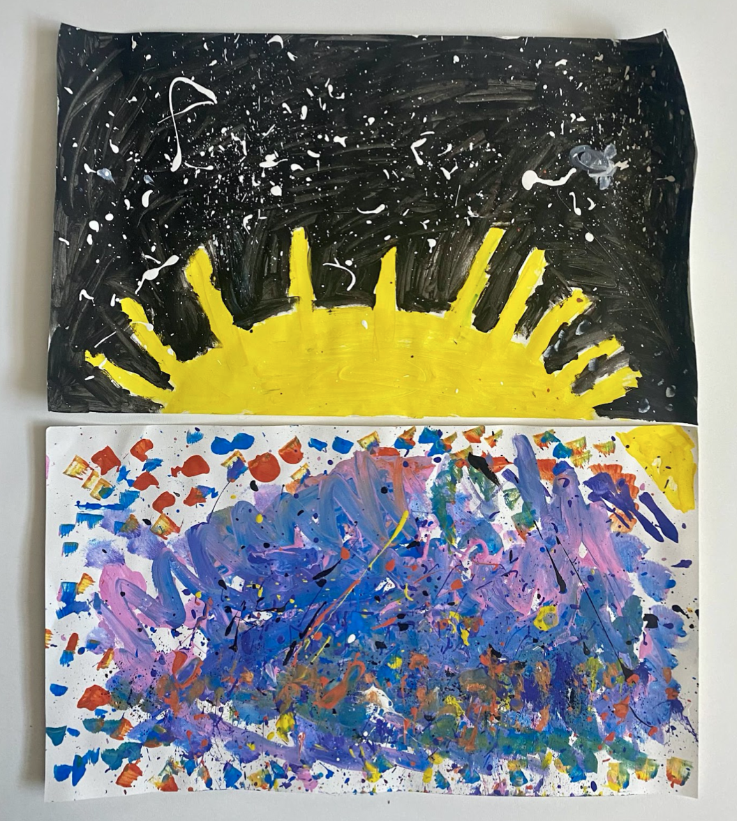 Here are two pieces of work from our Jackson Pollock inspired lesson. In this lesson, the students learned about an artist and experimented with non-traditional ways of using paint.